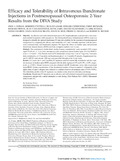 [en] OBJECTIVE: An effective and well tolerated intravenous (IV) bisphosphonate could provide a new treatment method for patients with osteoporosis. The Dosing IntraVenous Administration (DIVA) study was designed to identify the optimal ibandronate IV injection schedule for the treatment of postmenopausal osteoporosis by comparing the efficacy and tolerability of 2- and 3-monthly injections with the previously evaluated daily oral ibandronate regimen. We report the effects on lumbar spine and proximal femur bone mineral density (BMD) and bone resorption markers over 2 years. METHODS: This randomized, double-blind, double-dummy, noninferiority study recruited 1395 women (aged 55-80 yrs; > or = 5 yrs since menopause) with osteoporosis [mean lumbar spine (L2-L4) BMD T-score < -2.5 and > or = -5.0]. Patients received IV ibandronate (2 mg every 2 mo or 3 mg every 3 mo) plus daily oral placebo, or 2.5 mg daily oral ibandronate plus 2- or 3-monthly IV placebo. Supplemental vitamin D (400 IU) and calcium (500 mg) were provided throughout the 2-year study. RESULTS: At 2 years, the 2- and 3-monthly IV regimens achieved statistically noninferior and also superior increases in lumbar spine BMD compared with the daily regimen (6.4% and 6.3% vs 4.8%, respectively; p < 0.001). Greater increases were also obtained with IV ibandronate versus daily in proximal femur BMD. Serum concentrations of the biochemical marker of bone resorption C-telopeptide of the alpha-chain of type I collagen were reduced to a similar extent in all treatment arms (53.4%-59.9%). The tolerability profile of the IV regimens was similar to that observed with daily oral therapy. CONCLUSION: Ibandronate IV injections are an effective and well tolerated treatment for postmenopausal osteoporosis and provide a useful alternative to oral dosing.