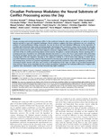 [en] Human morning and evening chronotypes differ in their preferred timing for sleep and wakefulness, as well as in optimal daytime periods to cope with cognitive challenges. Recent evidence suggests that these preferences are not a simple by-product of socio-professional timing constraints, but can be driven by inter-individual differences in the expression of circadian and homeostatic sleep-wake promoting signals. Chronotypes thus constitute a unique tool to access the interplay between those processes under normally entrained day-night conditions, and to investigate how they impinge onto higher cognitive control processes. Using functional magnetic resonance imaging (fMRI), we assessed the influence of chronotype and time-of-day on conflict processing-related cerebral activity throughout a normal waking day. Sixteen morning and 15 evening types were recorded at two individually adapted time points (1.5 versus 10.5 hours spent awake) while performing the Stroop paradigm. Results show that interference-related hemodynamic responses are maintained or even increased in evening types from the subjective morning to the subjective evening in a set of brain areas playing a pivotal role in successful inhibitory functioning, whereas they decreased in morning types under the same conditions. Furthermore, during the evening hours, activity in a posterior hypothalamic region putatively involved in sleep-wake regulation correlated in a chronotype-specific manner with slow wave activity at the beginning of the night, an index of accumulated homeostatic sleep pressure. These results shed light into the cerebral mechanisms underlying inter-individual differences of higher-order cognitive state maintenance under normally entrained day-night conditions.