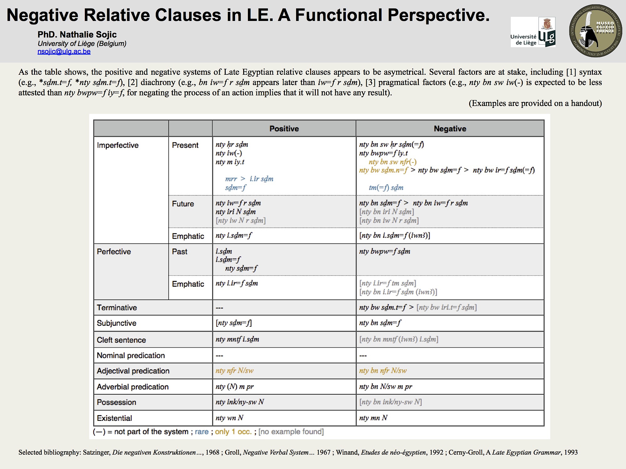 [en] The poster contains a functional taxonomy of the negative relative clauses in Late Egyptian