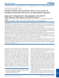 [en] RATIONALE: Stable isotope ratios of carbon and nitrogen are valuable tools for field ecologists to use to analyse animal diets. However, the application of these tools requires knowledge of the tissue enrichment factor (TEF) and half-life (HL). We experimentally compared TEF and HL in two freshwater fish larvae. We hypothesised that chub had a better growth/tissue replacement ratio than roach, due to the use of a food closer to their natural diet. METHODS: We determined the isotopic HL, the TEF and the contribution of growth or metabolic tissue replacement to dynamic isotopic incorporation. After yolk sac resorption, larvae were fed for 5 weeks with prey similar to their natural diet (Artemia nauplii) up to the isotopic equilibrium followed by Chironomid larvae. Stable isotope measurements were carried out using a continuous flow isotope ratio mass spectrometer coupled to an elemental analyser. RESULTS: Changes in isotopic composition strongly followed the predictions of exponential growth and time-dependent models. The isotopic HL varied between 8.2 and 12.6 days and the TEF of nitrogen and carbon ranged from 1.7 to 2.1‰ and from –0.9 to 1.2 ‰, respectively. The incorporation of dietary 13C was due more to the production of new tissue (between 56 and 79%) than to the metabolic process. Chub allocated more energy to growth than roach and the Chironomidae diet contributed more to the consumers’ growth than the Artemia diet.