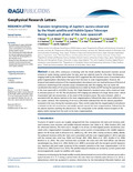 [en] In early 2014, continuous monitoring with the Hisaki satellite discovered transient auroral emission at Jupiter during a period when the solar wind was relatively quiet for a few days. Simultaneous imaging made by the Hubble Space Telescope (HST) suggested that the transient aurora is associated with a global magnetospheric disturbance that spans from the inner to outer magnetosphere. However, the temporal and spatial evolutions of the magnetospheric disturbance were not resolved because of the lack of continuous monitoring of the transient aurora simultaneously with the imaging. Here we report the coordinated observation of the aurora and plasma torus made by Hisaki and HST during the approach phase of the Juno spacecraft in mid‐2016. On day 142, Hisaki detected a transient aurora with a maximum total H2 emission power of ~8.5 TW. The simultaneous HST imaging was indicative of a large “dawn storm,” which is associated with tail reconnection, at the onset of the transient aurora. The outer emission, which is associated with hot plasma injection in the inner magnetosphere, followed the dawn storm within less than two Jupiter rotations. The monitoring of the torus with Hisaki indicated that the hot plasma population increased in the torus during the transient aurora. These results imply that the magnetospheric disturbance is initiated via the tail reconnection and rapidly expands toward the inner magnetosphere, followed by the hot plasma injection reaching the plasma torus. This corresponds to the radially inward transport of the plasma and/or energy from the outer to the inner magnetosphere.