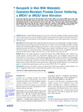 [en] PURPOSEBRCA1 or BRCA2 (BRCA) alterations are common in men with metastatic castration-resistant prostate cancer (mCRPC) and may confer sensitivity to poly(ADP-ribose) polymerase inhibitors. We present results from patients with mCRPC associated with a BRCA alteration treated with rucaparib 600 mg twice daily in the phase II TRITON2 study.METHODSWe enrolled patients who progressed after one to two lines of next-generation androgen receptor–directed therapy and one taxane-based chemotherapy for mCRPC. Efficacy and safety populations included patients with a deleterious BRCA alteration who received ≥ 1 dose of rucaparib. Key efficacy end points were objective response rate (ORR; per RECIST/Prostate Cancer Clinical Trials Working Group 3 in patients with measurable disease as assessed by blinded, independent radiology review and by investigators) and locally assessed prostate-specific antigen (PSA) response (≥ 50 decrease from baseline) rate.RESULTSEfficacy and safety populations included 115 patients with a BRCA alteration with or without measurable disease. Confirmed ORRs per independent radiology review and investigator assessment were 43.5 (95 CI, 31.0 to 56.7\%; 27 of 62 patients) and 50.8 (95 CI, 38.1 to 63.4\%; 33 of 65 patients), respectively. The confirmed PSA response rate was 54.8 (95 CI, 45.2 to 64.1\%; 63 of 115 patients). ORRs were similar for patients with a germline or somatic BRCA alteration and for patients with a BRCA1 or BRCA2 alteration, while a higher PSA response rate was observed in patients with a BRCA2 alteration. The most frequent grade ≥ 3 treatment-emergent adverse event was anemia (25.2\%; 29 of 115 patients).CONCLUSIONRucaparib has antitumor activity in patients with mCRPC and a deleterious BRCA alteration, but with a manageable safety profile consistent with that reported in other solid tumor types.