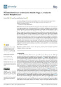 over large geographic areas. Although predation is involved in the declines of invaded amphibian populations, there is a lack of quantitative assessments evaluating the potential risk posed to native species. This is particularly true for Pelophylax water frogs, which have invaded large parts of western Europe, but no studies to date have examined their predation on other amphibians in their invaded range. Predation of native amphibians by marsh frogs (Pelophylax ridibundus) was assessed by stomach flushing once a month over four months in 21 ponds in southern France. Nine percent of stomachs contained amphibians. Seasonality was a major determinant of amphibian consumption. This effect was mediated by body size, with the largest invaders ingesting bigger natives, such as tree frogs. These results show that invasive marsh frogs represent a threat through their ability to forage on natives, particularly at the adult stage. The results also indicate that large numbers of native amphibians are predated. More broadly, the fact that predation was site- and time-specific highlights the need for repeated samplings across habitats and key periods for a clear understanding