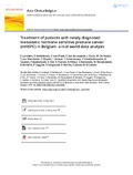 [en] INTRODUCTION: Abiraterone acetate + prednisone (AAP) and docetaxel have proven their efficacy in the treatment of patients with newly diagnosed metastatic hormone-sensitive prostate cancer (mHSPC) in clinical trials. However, real-world data are scarce. The goal of this study is to evaluate real-world data on the efficacy and safety of these therapies in mHSPC patients. PATIENTS AND METHODS: Records of 93 patients from 21 different centres were retrospectively reviewed. Primary and secondary endpoints were radiographic and PSA progression-free survival (RPFS - PSA-PFS) and cancer specific and overall survival (CSS - OS), respectively. Adverse events (AEs) were evaluated according to the Common Terminology Criteria for Adverse Events version 5.0. Differences in oncological outcome and AEs were evaluated between three treatment groups: ADT only (N=26) - ADT + AAP (N=48) - ADT + docetaxel (N=19). Survival analysis was performed using Kaplan-Meier statistics. RESULTS: Median RPFS was 13 months (95% confidence interval [CI]: 9-17) for ADT only, 21 months (95% CI: 19-23) for ADT + AAP and 12 months (95% CI: 11-14) for ADT + docetaxel (p = 0.004). The 1-year PSA-PFS, CSS and OS were 73.5%, 90.7% and 88.7%, respectively, with no significant differences between the three groups. Adverse events of grade 3 or higher were not observed more frequently. CONCLUSION: Retrospective real-world data show a significantly longer RPFS for mHSPC patients treated with ADT + AAP compared to ADT only or ADT + docetaxel at short-term follow-up. This can aid in counselling of mHSPC patients in daily clinical practice.