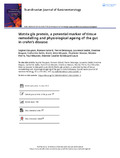 [en] Background: The inactive dephosphorylated and uncarboxylated form of the matrix Gla protein (dp-ucMGP) has been shown to be increased in plasma of inflammatory bowel disease (IBD) patients. Our aim was to assess if the plasmatic level of dp-ucMGP could reflect disease endoscopic activity, presence of strictures and cumulative structural bowel damage in Crohn’s disease (CD) patients. Methods: The plasmatic level of dp-ucMGP was measured in a monocentric cohort of prospectively recruited patients. The analysis was done by chemiluminescent immunoassay on blood samples collected the day of a planned ileocolonoscopy. In addition to classical clinical data (gender, age, body mass index (BMI), disease duration, current treatment), endoscopic data (disease location, Crohn’s Disease Endoscopic Index of Severity (CDEIS), mucosal healing (MH), presence of 9 CD lesion types) and biological markers (faecal calprotectin and C-reactive protein (CRP)) were collected. The association between dp-ucMGP level and Lémann index was also investigated. Univariate linear regression was used to investigate the relationship between dp-ucMGP level and different parameters collected. Results: A total of 82 ileocolonoscopies and dp-ucMGP assays were performed in 75 CD patients (45 females; 37 ileocolonic, 19 ileal and 19 colonic diseases) between October 2012 and November 2019. A total of 24 patients (29.3%) showed MH. The dp-ucMGP levels were not associated with MH, CDEIS, faecal calprotectin or CRP levels. Plasmatic dp-ucMGP levels increased significantly with age (p = 0.0032), disease duration (p = 0.0033), corticosteroids use (p = 0.019) and tended to increase in patients with intestinal strictures (p = 0.086) but not with the Lémann index. Conclusion: The significant increase of plasmatic dp-ucMGP levels with age, disease duration and the trend observed in patients with non-ulcerated strictures may suggest that this extracellular matrix protein could be a marker of tissue remodelling and physiological ageing of the gut.