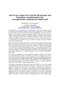 [fr] Cette contribution prolonge l’article intitulé “tu veux couper là faut dire pourquoi. Propositions pour une segmentation syntaxique du français parlé” (Benzitoun et al. 2010). Nous proposons de mobiliser les “marqueurs discursifs” (désormais MD) pour identifier les limites des unités maximales de traitement syntaxique. Certains MD peuvent en effet être considérés comme des marques grammaticales d’organisation syntaxique. L’examen de la distribution des MD permet de distinguer deux types de borneurs (introducteurs et terminatifs), qui apparaissent aux limites gauche et droite des unités quenous cherchons à délimiter. À côté de ces borneurs, nous distinguons les pivots (ambigus en termes de rattachement) et les locutifs (autonomes). Nous évaluons les limites de ces principes, strictement syntaxiques.