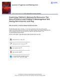 [en] Recent research has highlighted the critical role in children’s cognitive development of the metacognitive support parents give their children during everyday interactions. Our main goal was to examine whether parents made consistent use of metacognitive talk across different parent–child interaction contexts and to document the effect of this metacognitive talk across contexts on preschoolers’ memory. The relation between children’s and parents’ metacognitive talk was also examined, along with the link between children’s metacognitive talk and their own memory performance. 64 Belgian preschooler–parent dyads (Mage = 40.3 months) were invited to play memory games together and to reminisce about a standardized event. In both contexts, parents’ and children’s utterances were analyzed for their metacognitive content. Children’s episodic memory was assessed through a story-recall task. Results revealed that, in terms of frequency of use, parents exhibited a somewhat consistent metacognitive style across contexts. The nature of the metacognitive comments that were produced, however, varied depending on the context. Moreover, parents’ consistent production of higher rates of metacognitive comments in both contexts was found to be associated with better memory performance in children. Our data also revealed that children’s tendency to make metacognitive comments was related to their parents’ metacognitive production and to their own memory performance. By documenting the relations between parents’ and children’s metacognitive talk and the effect on children’s memory, this study provides promising avenues for a better understanding of how metacognitive processes might be involved in early memory development.
