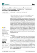 [en] We assessed the test–retest reliability and discriminative ability of a somatosensory temporal discrimination (SSTD) assessment tool for fibromyalgia syndrome (FMS) and determined if pain-related variables were associated with SSTD performance. Twenty-five women with FMS and twenty-five asymptomatic women were assessed during two sessions 7 to 10 days apart. The proportion of correct responses (range 0–100) was calculated. Sociodemographic information was collected for both groups. The participants with FMS also completed the widespread pain index and the Brief Pain Inventory. Test–retest reliability was verified by calculating intraclass correlation coefficients. Discriminative ability was verified by a between-group comparison of scores using a t-test. Associations between SSTD score and pain variables were tested using Pearson or Spearman correlation coefficients. The test–retest reliability of the SSTD score was excellent (ICC > 0.9, CI: 0.79–0.96) for the asymptomatic group and good for the FMS group (ICC: 0.81, 95% CI: 0.62–0.91). The median (Q1–Q3) test session SSTD score differed significantly between the FMS 84.1 (71–88) and the asymptomatic 91.6 (83.4–96.1) groups (p < 0.001). Only pain duration was associated with the SSTD score. In conclusion, the new SSTD test seems reliable for people with FMS and is discriminative. Further studies should examine its sensitivity to change and correlations with other SSTD tests.