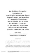 Dans les considérants qui précèdent la directive 2014/41, le législateur européen rappelle que si l’autorité d’émission est la mieux placée pour décider, en fonction de sa connaissance des éléments de l’enquête concernée, des mesures d’enquête auxquelles il y a lieu de recourir, il ajoute qu’il sied à cette autorité de vérifier « si la preuve recherchée est nécessaire et proportionnée aux fins de la procédure, si la mesure d’enquête choisie est nécessaire et proportionnée aux fins de l’obtention de la preuve concernée, et si une décision d’enquête européenne être émise aux fins d’associer un autre État membre à l’obtention de cette preuve. Ces mêmes vérifications devraient être effectuées dans le cadre de la procédure de validation, lorsque la validation d’une décision d’enquête européenne est requise au titre de la présente directive. L’exécution d’une décision d’enquête européenne ne devrait pas être refusée pour des motifs autres que ceux mentionnés dans la présente directive. Néanmoins, l’autorité d’exécution devrait pouvoir choisir une mesure d’enquête moins intrusive que celle indiquée dans la décision d’enquête européenne concernée si elle permet d’atteindre des résultats similaires. L'article nous donne l’occasion de revenir, à la lumière d’une jurisprudence récente, sur trois sujets distincts, à savoir la notion d’« autorité d’émission » de la DEE, la validité des preuves recueillies à l’étranger et les voies de recours offertes par la loi belge aux justiciables dont les biens ont été saisis.