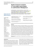 [en] The spatial and temporal distribution of macroalgal assemblages at 10 sites in the Baie de Ranobe and Baie de Toliara in southwestern Madagascar were investigated during warm (February to March) and cool (July to August) seasons. Algal species were identified and coverage estimated at six habitats between the shore and 15 m depth, based on surveys with 0.5 m x 0.5 m quadrats along transects of 30 m long by 5 m broad. Ninety eight taxa (53 red, 24 green, 21 brown) were identified of which 42 were edible. Species dominance varied by bay and season, with Sargassum latifolium dominating during the warm season, and Hypnea musciformis and Ulva lactuca prevalent during the cool season. Algal cover did not differ significantly between bays, but cover differed significantly between habitats. S. latifolium, U. lactuca, and H. musciformis were prominent on the algal shelf, Ulva reticulata on the inner shelf, and Amansia rhodantha on the outer shelf. Edible seaweed proportions increased during the cool season, particularly at algal and inner-shelf habitats. Generalized Linear Model analysis confirmed significant differences in edible algal cover across habitats and seasons. The potential of sustainably using macroalgae for aquaculture and human consumption in southwestern Madagascar is highlighted.