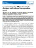 [en] Lysosomes must maintain the integrity of their limiting membrane to ensure efficient fusion with incoming organelles and degradation of substrates within their lumen. Pancreatic cancer cells upregulate lysosomal biogenesis to enhance nutrient recycling and stress resistance, but it is unknown whether dedicated programmes for maintaining the integrity of the lysosome membrane facilitate pancreatic cancer growth. Using proteomic-based organelle profiling, we identify the Ferlin family plasma membrane repair factor Myoferlin as selectively and highly enriched on the membrane of pancreatic cancer lysosomes. Mechanistically, lysosomal localization of Myoferlin is necessary and sufficient for the maintenance of lysosome health and provides an early acting protective system against membrane damage that is independent of the endosomal sorting complex required for transport (ESCRT)-mediated repair network. Myoferlin is upregulated in human pancreatic cancer, predicts poor survival and its ablation severely impairs lysosome function and tumour growth in vivo. Thus, retargeting of plasma membrane repair factors enhances the pro-oncogenic activities of the lysosome.