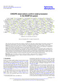 [en] Aims. We aim to observe the transits and occultations of WASP-33 b, which orbits a rapidly rotating δ Scuti pulsator, with the goal of measuring the orbital obliquity via the gravity-darkening effect, and constraining the geometric albedo via the occultation depth. Methods. We observed four transits and four occultations with CHEOPS, and employ a variety of techniques to remove the effects of the stellar pulsations from the light curves, as well as the usual CHEOPS systematic effects. We also performed a comprehensive analysis of low-resolution spectral and Gaia data to re-determine the stellar properties of WASP-33. Results. We measure an orbital obliquity 111.3+−00.27 degrees, which is consistent with previous measurements made via Doppler tomography. We also measure the planetary impact parameter, and confirm that this parameter is undergoing rapid secular evolution as a result of nodal precession of the planetary orbit. This precession allows us to determine the second-order fluid Love number of the star, which we find agrees well with the predictions of theoretical stellar models. We are unable to robustly measure a unique value of the occultation depth, and emphasise the need for long-baseline observations to better measure the pulsation periods.