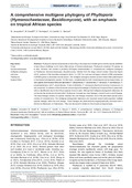 [en] Phylloporia (Hymenochaetaceae) is becoming a very large and complex genus and the species definition is becoming a challenge, as for many other groups of Hymenochaetaceae. Phylloporia comprises 79 species up to date. However, this number is probably still largely underestimated. A comprehensive, multigene phylogeny of Phylloporia (Hymenochaetaceae, Basidiomycota), inferred from the large subunit nuclear ribosomal region (LSU), portions of the translation elongation factor 1-α (TEF-1α), and second largest subunit of RNA polymerase II (RPB2) genes is presented and discussed. The multigene phylogeny reveals several undescribed paleotropical or neotropical phylogenetic species. On this basis, complemented by both morphological and ecological data, six new species from tropical Africa are described: P. afropectinata, P. cinnamomea, P. memecyli, P. miomboensis, P. pseudoweberiana, and P. warneckeicola. A new combination, P. microspora (basionym Inonotus microsporus), is also proposed. A synthesis of the taxonomic and ecological knowledge of Phylloporia in tropical Africa is presented, with an identification key for the African species known to date. Although the multigene phylogenetic inferences do not resolve the backbone structure within Phylloporia, it reveals two main lineages, a basal A and a core B lineage. The basal lineage contains six species whereas the core lineage comprises most of the described species and a number of unnamed taxa. The multigene phylogenetic inferences also resolved several well-supported, multiple species lineages within the core lineage. These lineages are predominantly biogeographically structured with a dichotomy Neotropics vs Paleotropics. They are discussed in relation to the morpho-ecological types.
