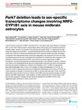 [en] Loss-of-function mutations in PARK7, encoding for DJ-1, can lead to early onset Parkinson's disease (PD). In mice, Park7 deletion leads to dopaminergic deficits during aging, and increased sensitivity to oxidative stress. However, the severity of the reported phenotypes varies. To understand the early molecular changes upon loss of DJ-1, we performed transcriptomic profiling of midbrain sections from young mice. While at 3 months the transcriptomes of both male and female mice were unchanged compared to their wildtype littermates, an extensive deregulation was observed in 8 month-old males. The affected genes are involved in processes like focal adhesion, extracellular matrix interaction, and epithelial-to-mesenchymal transition (EMT), and enriched for primary target genes of NRF2. Consistently, the antioxidant response was altered specifically in the midbrain of male DJ-1 deficient mice. Many of the misregulated genes are known target genes of estrogen and retinoic acid signaling and show sex-specific expression in wildtype mice. Depletion of DJ-1 or NRF2 in male primary astrocytes recapitulated many of the in vivo changes, including downregulation of CYP1B1, an enzyme involved in estrogen and retinoic acid metabolism. Interestingly, knock-down of CYP1B1 led to gene expression changes in focal adhesion and EMT in primary male astrocytes. Finally, male iPSC-derived astrocytes with loss of function mutation in the PARK7 gene also showed changes in the EMT pathway and NRF2 target genes. Taken together, our data indicate that loss of Park7 leads to sex-specific gene expression changes through astrocytic alterations in the NRF2-CYP1B1 axis, suggesting higher sensitivity of males to loss of DJ-1.