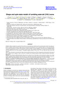 [en] Context. Stellar occultations by asteroids observed from several stations are routinely used to reconstruct the asteroid's sky-plane projections. Together with the asteroid's shape model reconstructed from photometry, such occultations enable us to precisely determine its size and reveal details of its shape. When reducing occultation timings, the usual assumption is that the star has a negligible angular diameter compared to the asteroid, so it is modeled as a point source. The occultation of Betelgeuse (α Orionis) by asteroid (319) Leona on 12 December 2023 was a rare exception – the apparent angular diameter of the star was ∼50 mas, about the same as that of the asteroid. Aims. This work aimed to reconstruct the shape and spin model of asteroid Leona. Then, the projection of that model for the time of the occultation can be computed, which is necessary to interpret the occultation timings and infer valuable information about Betelgeuse itself. Methods. We collected available photometric data of Leona, carried out new observations, and reconstructed a unique convex shape model. Using three other occultations observed in 2023, we scaled this convex model. We also reconstructed an alternative nonconvex model with the same spin parameters and size but showing some surface details that explain better one of the occultations. Results. We confirmed the tumbling rotation state of Leona and uniquely determined the rotation period Pψ = 1172.2 ± 0.3 h and the precession period Pϕ = 314.27 ± 0.02 h. The volume-equivalent diameter determined by occultations is 59.1 ± 0.9 km. The reconstructed shape model of Leona enabled us to compute its sky-plane projection for the time of the Betelgeuse occultation. Conclusions. A reliable shape model with accurate dimensions and accurate rotation and precession periods has been reconstructed for slowly tumbling asteroid Leona. It can be used to interpret the observed occultation of Betelgeuse by Leona.
