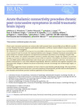 [en] Chronic post-concussive symptoms are common after mild traumatic brain injury (mTBI) and are difficult to predict or treat. Thalamic functional integrity is particularly vulnerable in mTBI and may be related to long-term outcomes but requires further investigation. We compared structural MRI and resting state functional MRI in 108 patients with a Glasgow Coma Scale (GCS) of 13-15 and normal CT, and 76 controls. We examined whether acute changes in thalamic functional connectivity were early markers for persistent symptoms and explored neurochemical associations of our findings using PET data. Of the mTBI cohort, 47% showed incomplete recovery 6 months post-injury. Despite the absence of structural changes, we found acute thalamic hyperconnectivity in mTBI, with specific vulnerabilities of individual thalamic nuclei. Acute fMRI markers differentiated those with chronic post-concussive symptoms, with time- and outcome-dependent relationships in a sub-cohort followed longitudinally. Moreover, emotional and cognitive symptoms were associated with changes in thalamic functional connectivity to known serotonergic and noradrenergic targets, respectively. Our findings suggest that chronic symptoms can have a basis in early thalamic pathophysiology. This may aid identification of patients at risk of chronic post-concussive symptoms following mTBI, provide a basis for development of new therapies and facilitate precision medicine application of these therapies.