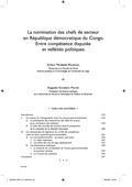 [fr] Cet article décrypte le conflit opposant deux membres du gouvernement congolais au sujet de la nomination des Chefs de secteur en République démocratique du Congo, en général et en Province du Nord-Kivu, en particulier. Au-delà de l'examen des textes juridiques, cet article met en évidence les logiques de la politisation de l'administration dans un environnement préélectoral. Il ressort que les enjeux de rétribution des militants des partis au pouvoir ainsi que la conquête de la clientèle électorale ont été les principaux enjeux de ce duel. Par ailleurs, les mécanismes de règlement de ce conflit de compétence sont ici proposés.