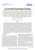[en] One of the main goals of the NASA Transiting Exoplanet Survey Satellite (TESS) mission is the discovery of Earth-like planets around nearby M-dwarf stars. We present the discovery and validation of three new short-period Earth-sized planets orbiting nearby M dwarfs: TOI-5720 b, TOI-6008 b, and TOI-6086 b. We combined TESS data, ground-based multicolor light curves, ground-based optical and near-infrared spectroscopy, and Subaru/IRD radial velocity data to validate the planetary candidates and constrain the physical parameters of the systems. In addition, we used archival images, high-resolution imaging, and statistical validation techniques to support the planetary validation. TOI-5720 b is an Earth-sized planet with a radius of Rp = 1.09 ± 0.07 Rp. It orbits a nearby (36 pc) M 2.5 host with an orbital period of P = 1.4344555 ± 0.0000036 days. It has an equilibrium temperature of Teq = 708 ± 19 K (assuming a null albedo) and an incident flux of Sp = 41.7 ± 4.5 Sp. TOI-6008 b is a short-period planet of P = 0.8574347 ± 0.0000424 day. It has a radius of Rp = 1.03 ± 0.05 Rp, an equilibrium temperature of Teq = 707 ± 19 K, and an incident flux of Sp = 41.5 ± 4.5 Sp. The host star (TOI-6008) is a nearby (23 pc) M 5 with an effective temperature of Teff = 3075 ± 75 K. Based on the radial velocity measurements collected with Subaru/IRD, we set a 3upper limit of Mp < 4 Mp, thus ruling out a star or brown dwarf as the transiting companion. TOI-6086 b orbits its nearby (32 pc) M 3 host star (Teff = 3200 ± 75 K) every 1.3888725 ± 0.0000827 days and has a radius of Rp = 1.18 ± 0.07 Rp, an equilibrium temperature of Teq = 634 ± 16 K, and an incident flux of Sp = 26.8 ± 2.7 Sp. Additional high-precision radial velocity measurements are needed to derive the planetary masses and bulk densities and to search for additional planets in the systems. Moreover, short-period Earth-sized planets orbiting around nearby M dwarfs are suitable targets for an atmospheric characterization with the James Webb Space Telescope through transmission and emission spectroscopy and phase-curve photometry.