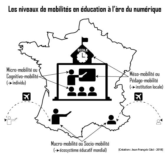 [fr] L’objet de cette contribution est d’étudier la mobilité en éducation, au prisme des interactions numériques scolaires. Nous étudierons pour cela les usages et perceptions autour du numérique éducatif, des enseignants et apprenants, du collège à l’université. En première partie, nous proposerons une typologie des mobilités éducatives que nous conceptualiserons selon trois niveaux : micro-mobilité, méso-mobilité et macro-mobilité. Ces niveaux seront détaillés par une cartographie conceptuelle. En deuxième partie et grâce aux résultats d’une étude empirique menée sur cinq établissements d’une ville française, nous illustrerons certaines formes de mobilités éducatives et répondrons à diverses questions portant sur le numérique comme support d’apprentissage. Au final, notre écosystème éducatif s’est-il emparé du numérique, notamment pour développer la mobilité dans une société mondialisée ? [en] The purpose of this contribution is to study mobility in education, through the prism of digital school interactions. To do this, we will study the uses and perceptions around digital education, of teachers and learners, from college to university. In the first part, we will propose a typology of educational mobility that we will conceptualize according to three levels: micro-mobility, meso-mobility and macro-mobility. These levels will be detailed by a mind-mapping. In the second part and thanks to the results of an empirical study carried out on five establishments in a French city, we will illustrate certain forms of educational mobility and answer various questions relating to digital technology as a learning medium. In the end, has our educational ecosystem taken hold of digital, in particular to develop mobility in a globalized society?