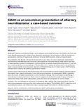 [en] Background: Olfactory neuroblastoma (ONB) is a rare malignant neuroectodermal tumour that usually arises in the nasal cavity, typically presenting with unilateral nasal obstruction and epistaxis. In rare instances, ONB can manifest as a paraneoplastic syndrome of inappropriate antidiuretic hormone (SIADH) secretion, leading to hyponatremia.