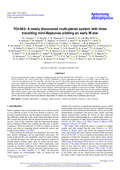 [en] We present the detection of three exoplanets orbiting the early M dwarf TOI-663 (TIC 54962195; V = 13.7 mag, J = 10.4 mag, R* = 0.512 ± 0.015 R☉, M* = 0.514 ± 0.012 M☉, d = 64 pc). TOI-663 b, c, and d, with respective radii of 2.27 ± 0.10 R+, 2.26 ± 0.10 R+, and 1.92 ± 0.13 R+ and masses of 4.45 ± 0.65 M+, 3.65 ± 0.97 M+, and <5.2 M+ at 99%, are located just above the radius valley that separates rocky and volatile-rich exoplanets. The planet candidates are identified in two TESS sectors and are validated with ground-based photometric follow-up, precise radial-velocity measurements, and high-resolution imaging. We used the software package juliet to jointly model the photometric and radial-velocity datasets, with Gaussian processes applied to correct for systematics. The three planets discovered in the TOI-663 system are low-mass mini-Neptunes with radii significantly larger than those of rocky analogs, implying that volatiles, such as water, must predominate. In addition to this internal structure analysis, we also performed a dynamical analysis that confirmed the stability of the system. The three exoplanets in the TOI-663 system, similarly to other sub-Neptunes orbiting M dwarfs, have been found to have lower densities than planets of similar sizes orbiting stars of different spectral types.