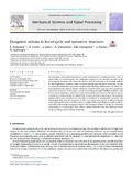 [en] The emergence of localised vibrations in cyclic and symmetric rotating structures, such as bladed disks of aircraft engines, has challenged engineers in the past few decades. In the linear regime, localised states may arise due to a lack of symmetry, as for example induced by inhomogeneities. However, when structures deviate from the linear behaviour, e.g. due to material nonlinearities, geometric nonlinearities like large deformations, or other nonlinear elements like joints or friction interfaces, localised states may arise even in perfectly symmetric structures. In this paper, a system consisting of coupled Duffing oscillators with linear viscous damping is subjected to external travelling wave forcing. The system may be considered a minimal model for bladed disks in turbomachinery operating in the nonlinear regime, where such excitation may arise due to imbalance or aerodynamic excitation. We demonstrate that near the resonance, in this non-conservative regime, localised vibration states bifurcate from the travelling waves. Complex bifurcation diagrams result, comprising stable and unstable dissipative solitons. The localised solutions can also be continued numerically to a conservative limit, where solitons bifurcate from the backbone curves of the travelling waves at finite amplitudes.