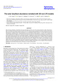 [en] The present-day abundance of beryllium in the solar atmosphere provides clues about mixing mechanisms within stellar interiors. However, abundance determinations based on the BeII313.107 nm line are prone to systematic errors due to imperfect model spectra. These errors arise from missing continuous opacity in the UV, a significant unidentified blend at 313.102 nm, departures from local thermodynamic equilibrium (LTE), and microturbulence and macroturbulence fudge parameters associated with one-dimensional (1D) hydrostatic model atmospheres. Although these factors have been discussed in the literature, no study has yet accounted for all of them simultaneously. To address this, we present 3D non-LTE calculations for neutral and ionised beryllium in the Sun. We used these models to derive the present-day solar beryllium abundance, calibrating the missing opacity on high resolution solar irradiance data and the unidentified blend on the centre-to-limb variation. We find a surface abundance of 1.21 ± 0.05 dex, which is significantly lower than the value of 1.38 dex that has been commonly adopted since 2004. Taking the initial abundance via CI chondrites, our result implies that beryllium has been depleted from the surface by an extra 0.11 ± 0.06 dex, or 22 ± 11%, on top of any effects of atomic diffusion. This is in tension with standard solar models, which predict negligible depletion, as well as with contemporary solar models that have extra mixing calibrated on the abundances of helium and lithium, which predict excessive depletion. These discrepancies highlight the need for further improvements to the physics in solar and stellar models.